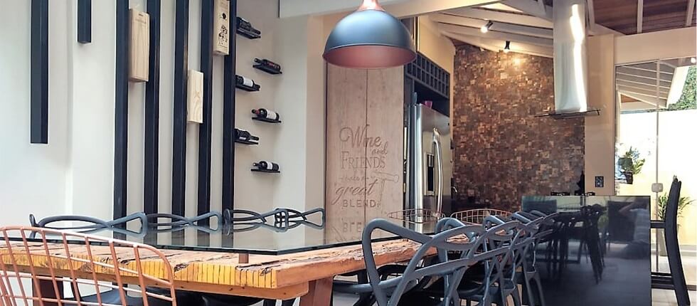 Um espaço de convivência e aprendizado, onde a família reúne amantes do vinho e da gastronomia. Para estes ambientes construímos uma estrutura em metalon, madeiras de demolição no mobiliário contrastando com materiais mais contemporâneos nos revestimentos e iluminação. A personalização da marcenaria foi um dos destaques, onde os próprios clientes criaram a frase convidativa para amigos e familiares: ” Wine and friends have a great blend”.